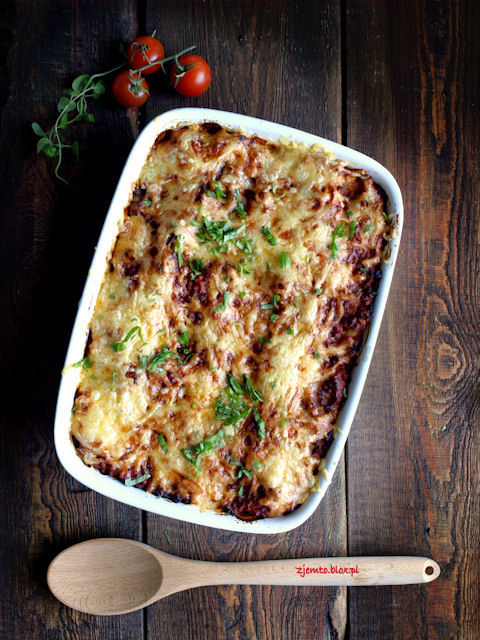 Hmmm, niestety mnie ta zapiekanka nie wyszła. Konsystencja sosu serowego przy 3 szklankach mleka okazała się być bardzo wodnista, dorzuciłam prawie dwa razy więcej sera, zblendowałam (bo ser nie chciał się rozpuścić a wciąż nie przypominało to „sosu”), a po upieczeniu … nie dało się tego zjeść 😉