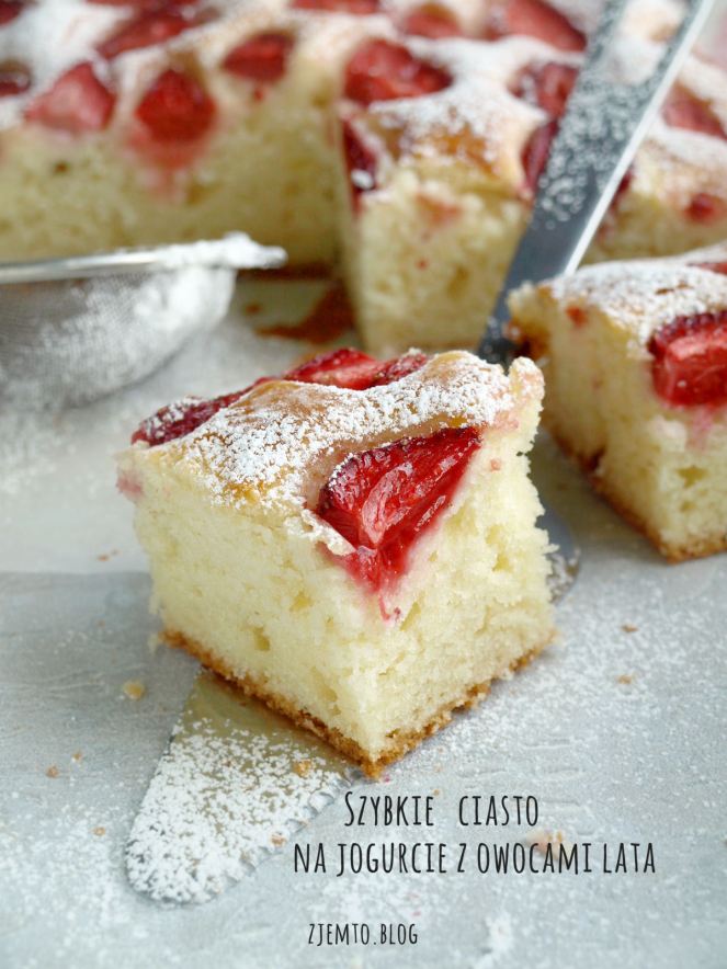 Szybkie, najprostsze ciasto jogurtowe z truskawkami. Puszyste, delikatne, a zarazem wilgotne i mięsiste. Dzięki słodko-kwaśnym owocom i lekkiej nucie cytrynowej przyjemnie orzeźwiające.