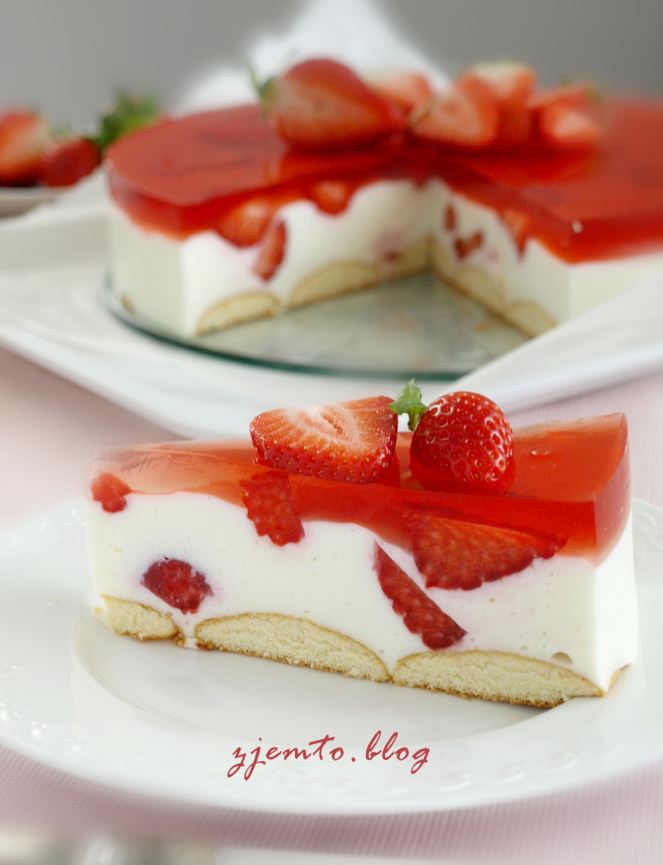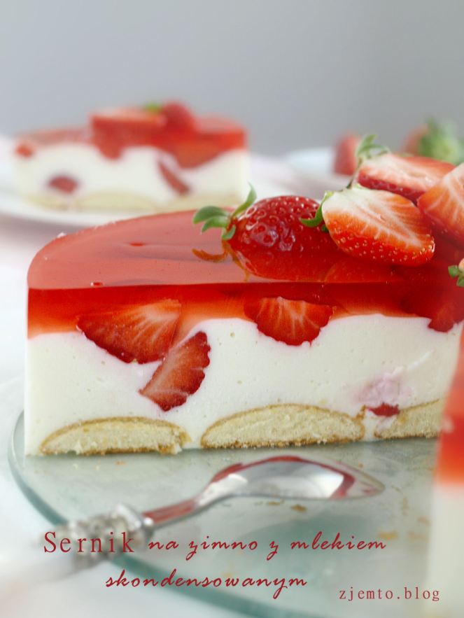 Dla fanów truskawek i mleka skondensowanego. Prosty sernik, do przygotowania w kilka chwil. Spód z miękkich biszkoptów, kawałki truskawek zanurzone w mlecznej masie serowej pod orzeźwiającą galaretką.