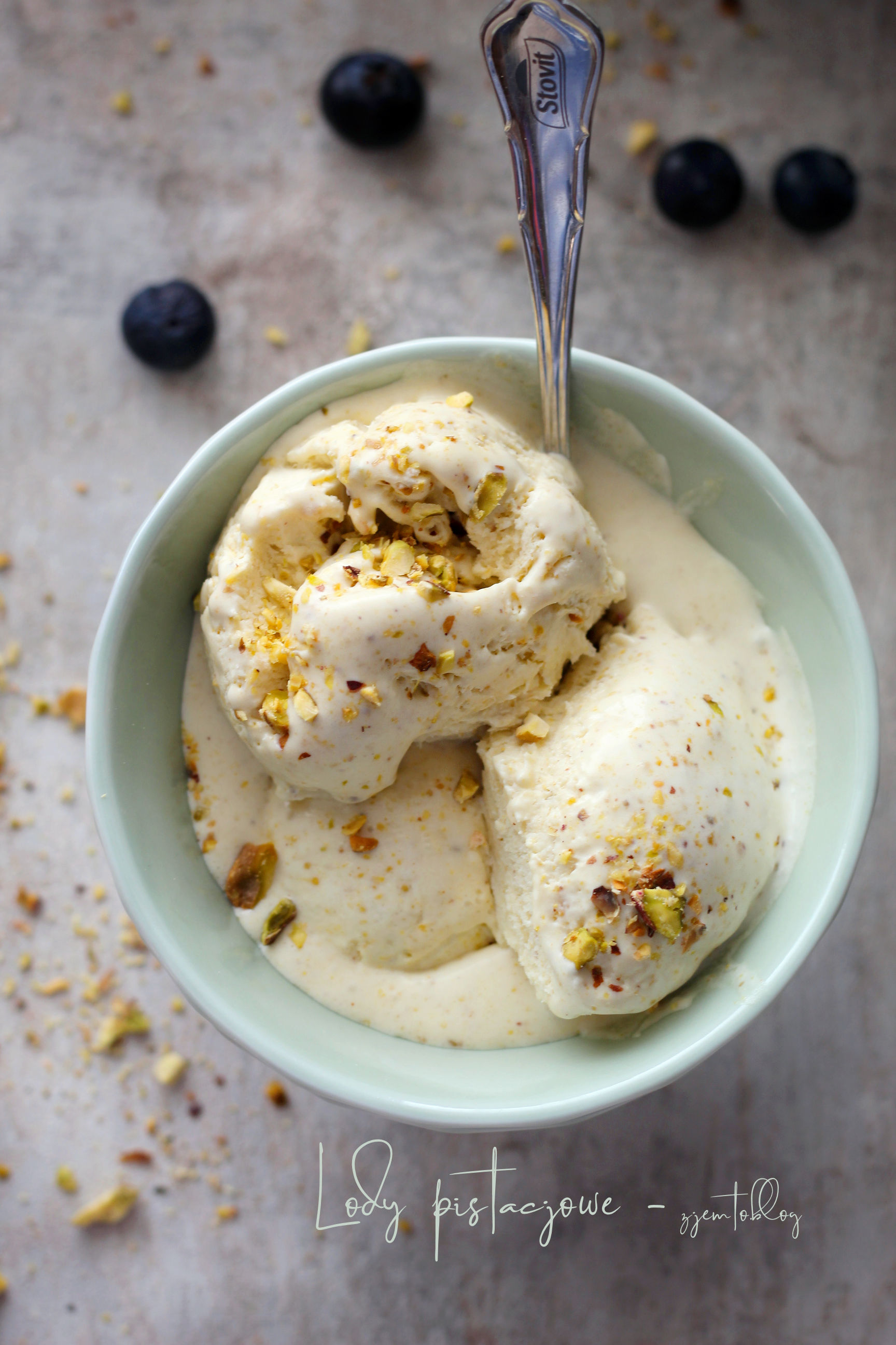 Śmietankę ubić, ale nie całkowicie. Powinna się lekko spienić i zgęstnieć. Dodać mleko skondensowane i pastę pistacjową. Krótko ubić do połączenia składników. Przelać do pojemnika. Wstawić do zamrażarki na ok. 4 godziny.