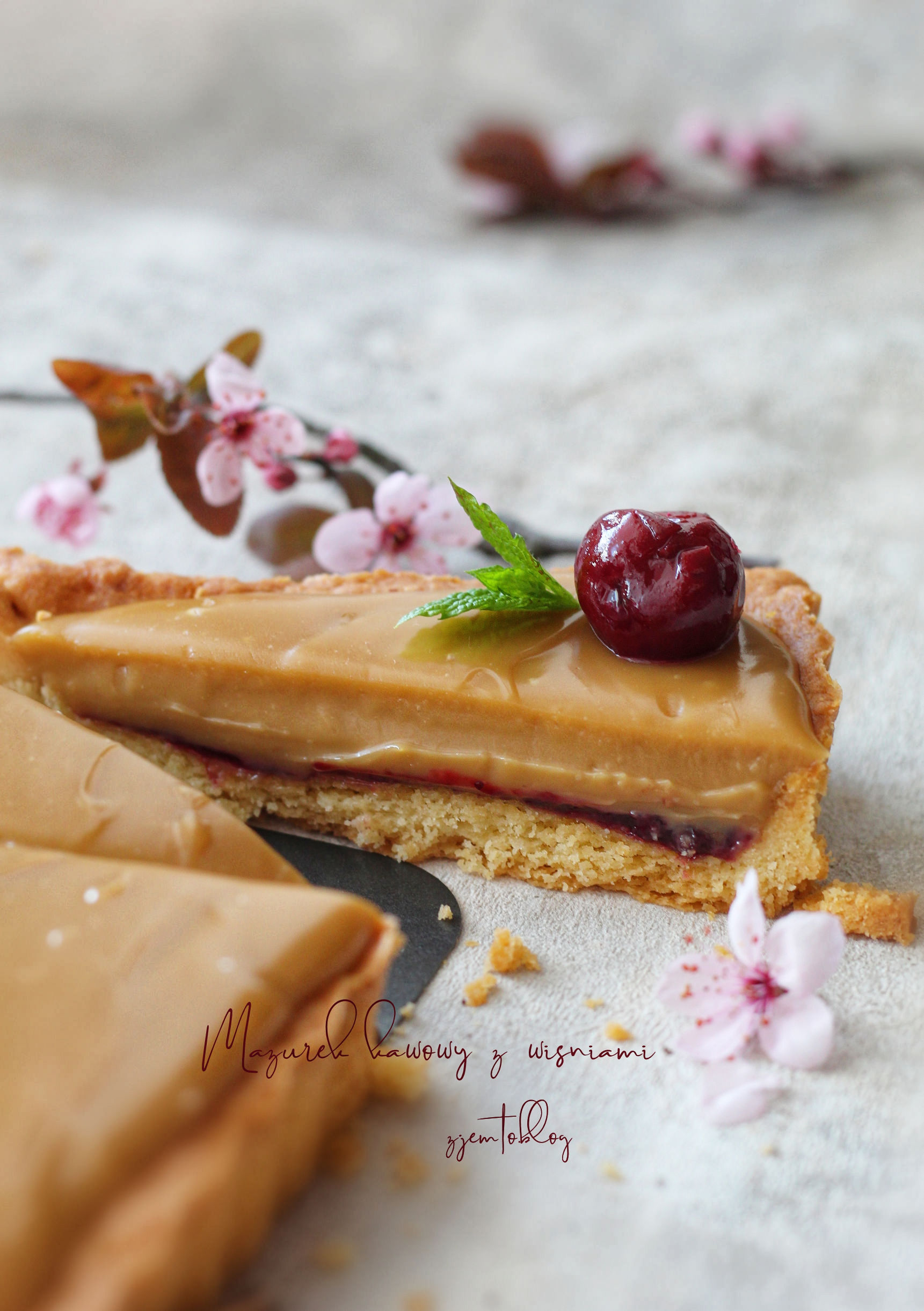Mazurek Wielkanocny dla fanów kawowego smaku w wypiekach. Tradycyjny, na kruchym cieście, z pyszną kawową masą na bazie mascarpone i białej czekolady. Nie przesłodzony, z dodatkiem konfitury wiśnowej i mrożonych wiśni. Prosty do odtworzenia i bezproblemowy.