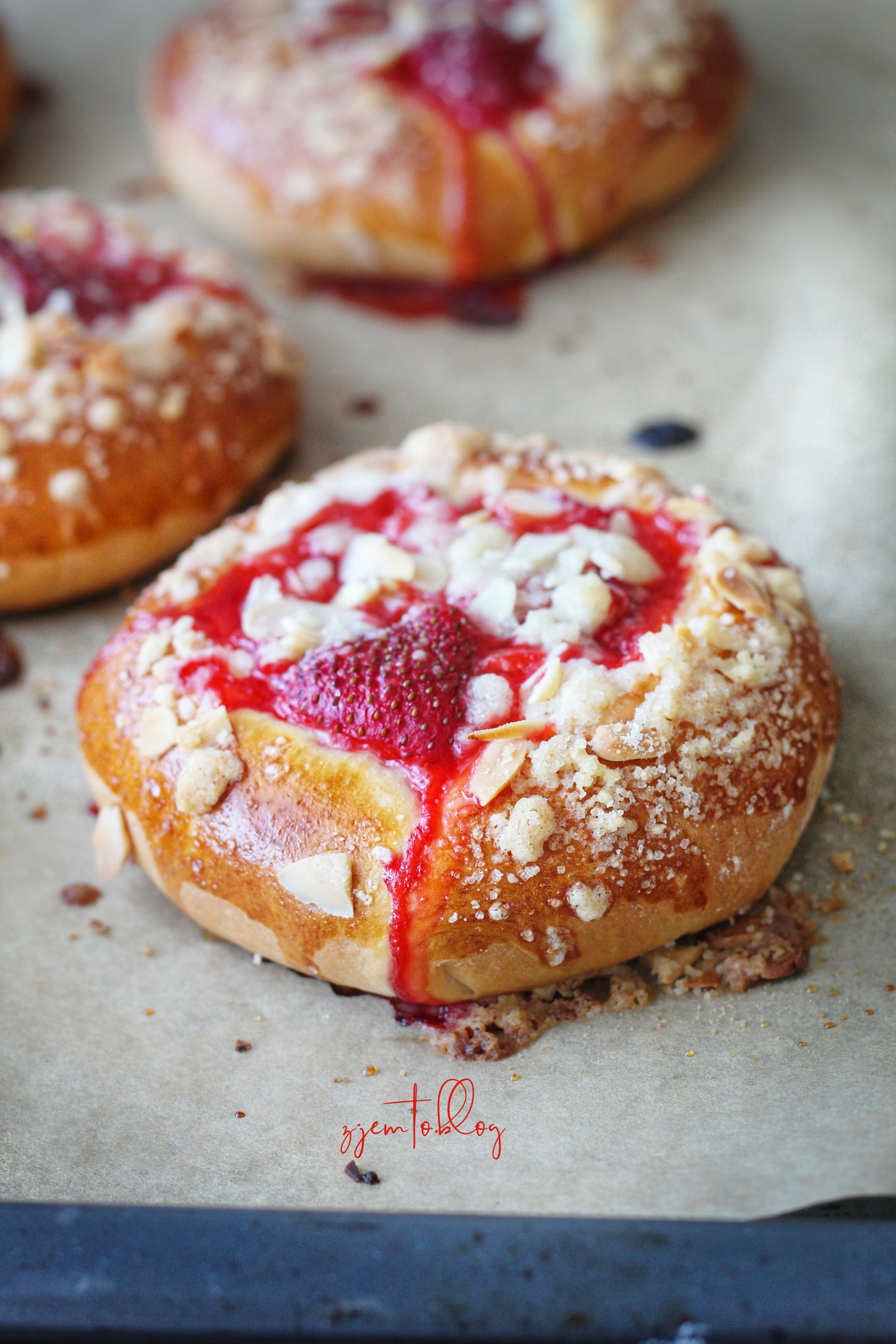 W sezonie truskawkowym pozycja obowiązkowa. Pulchne, mięciutkie drożdżówki z kawałkami pysznych owoców i chrupiącą kruszonką migdałową.
