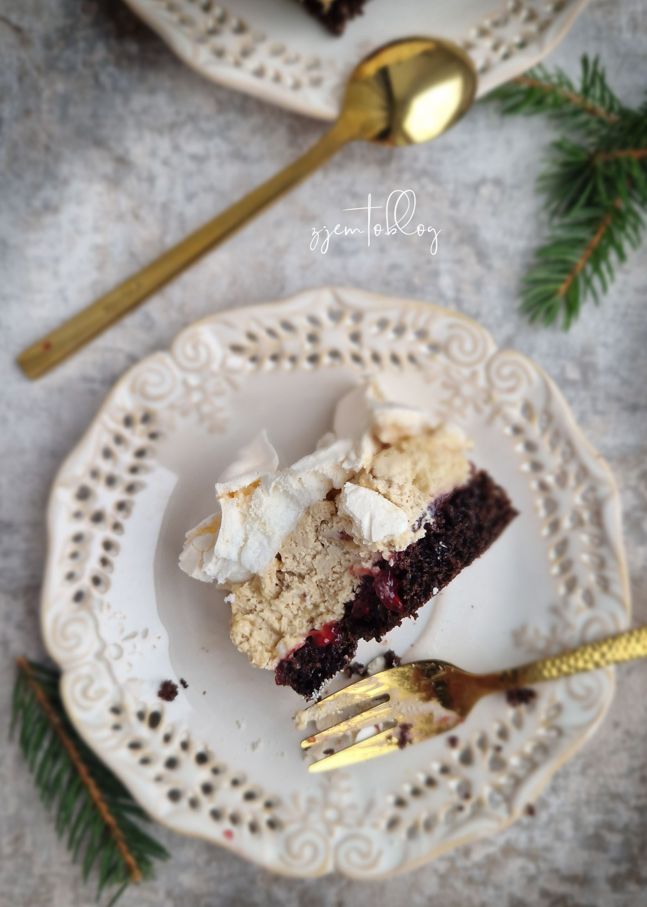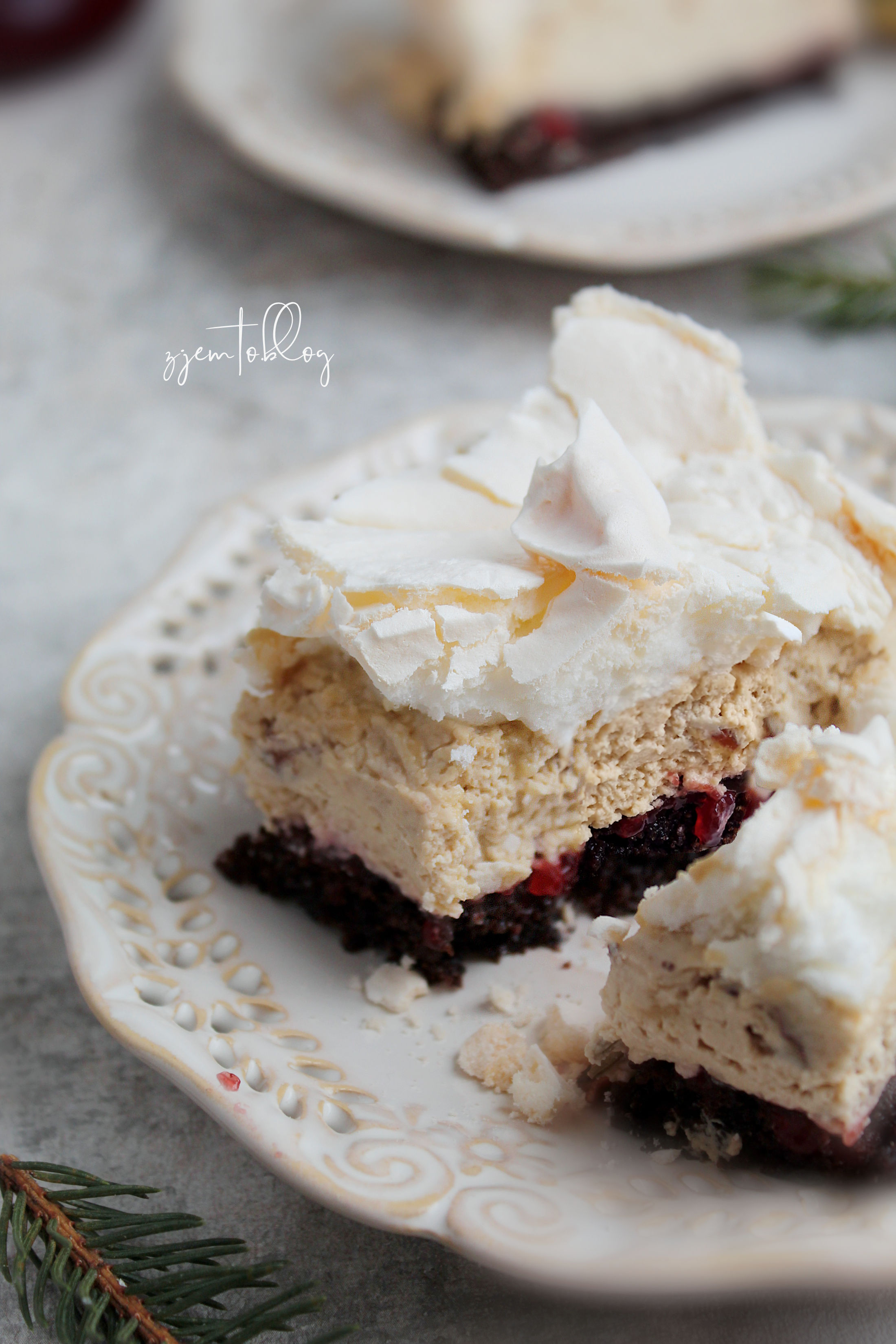 Kremowe ciasto na makowym spodzie. Świąteczna wersja Kostki Dakłas. Makowy spód z konfiturą wiśniową, kawowy krem z kawałkami chałwy i orzechów oraz chrupiąca, słodka beza. Całość jest pyszna i nieprzesłodzona, bogata w smaku i godna świątecznego stołu.