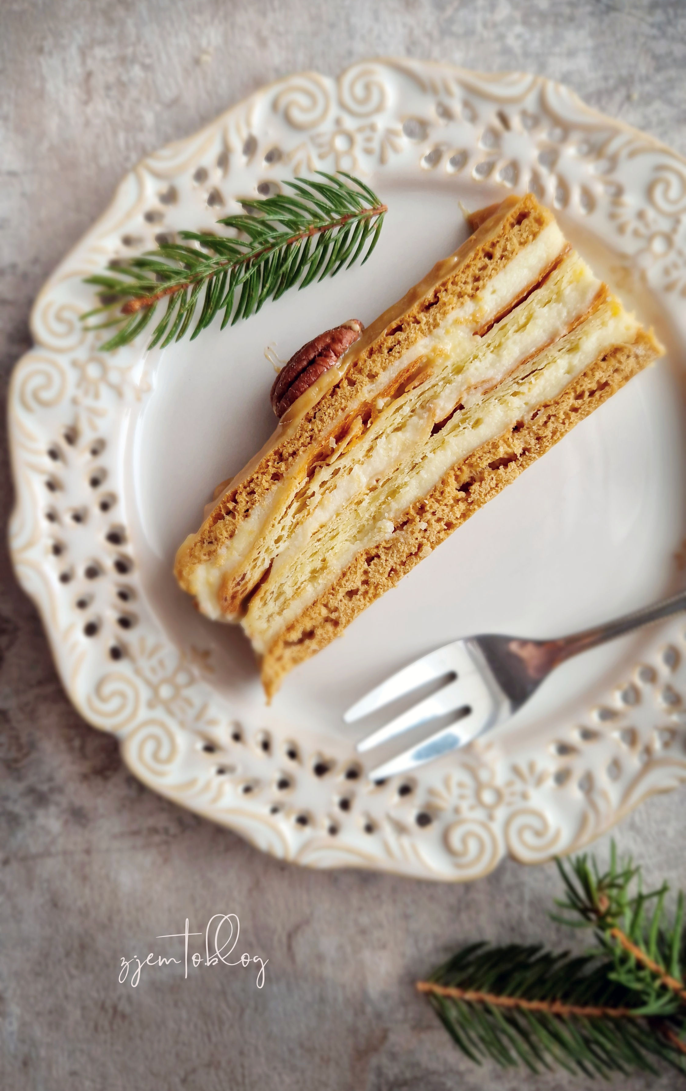 Miodownik i tort Napoleon w jednym. Tak najłatwiej opisać to wyjątkowe ciasto. Dwa płaty ciasta półfrancuskiego pomiędzy ciastem miodowym, a wszystko przełożone aksamitnym kremem budyniowym. Ciasto jest duże, bardzo podzielne, dobrze się kroi, świetne na większe uroczystości.