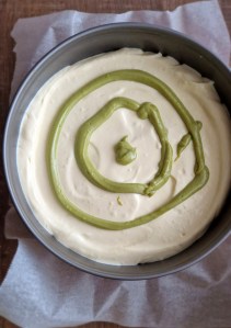 * Jeśli chcecie uzyskać efekt pasków wewnątrz sernika wystarczy 1 łyżkę kremu pistacjowego wymieszać z 2 łyżkami masy serowej. Wylać połowę masy serowej i wyłożyć przygotowaną mieszankę. Można punktowo lub tak jak na zdj. Następnie wylać pozostałą masę serową.