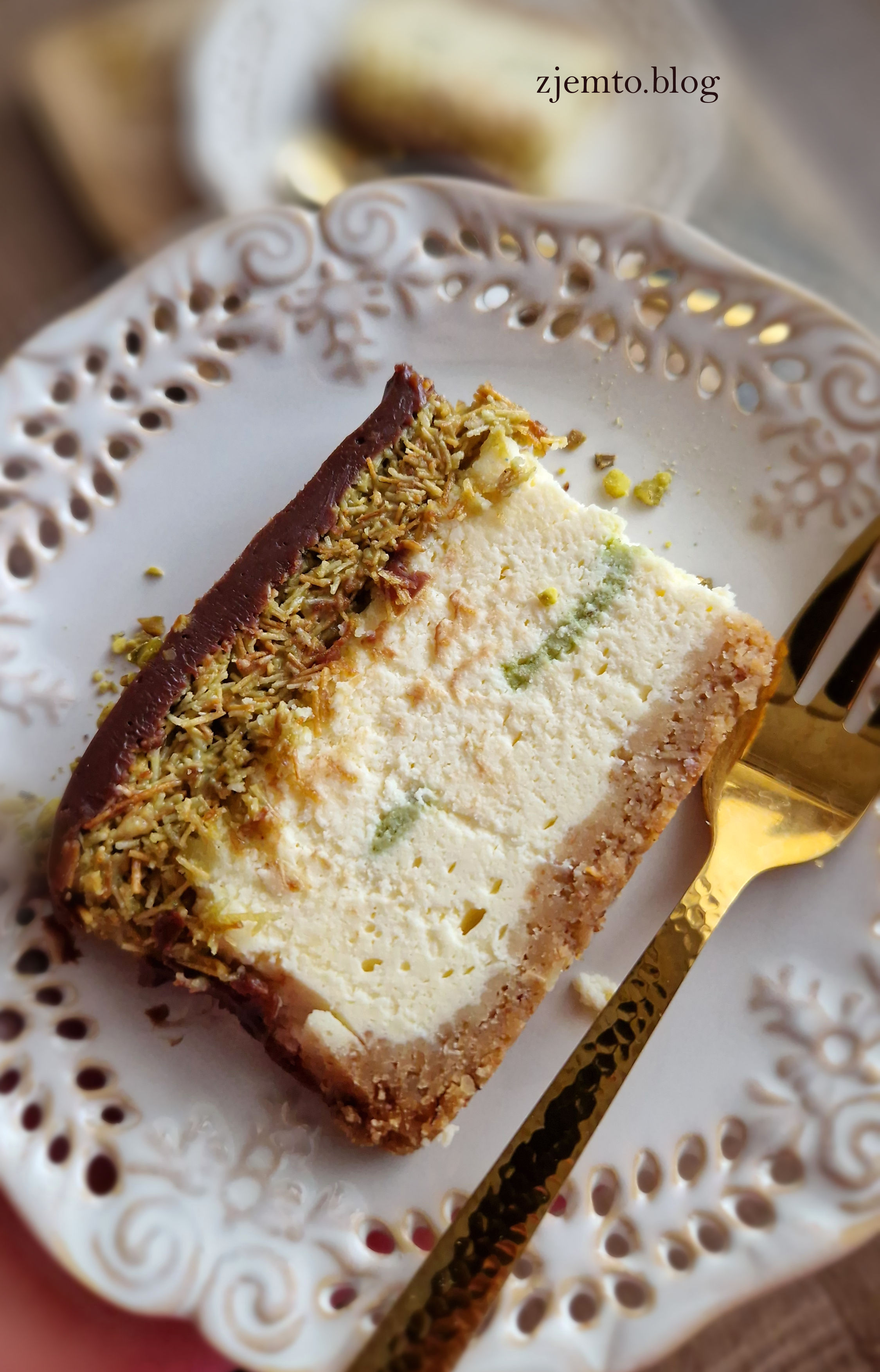 Wyborny, kremowy sernik z modnymi dodatkami w stylu dubajskim. Wilgotny, waniliowy, na ciasteczkowym spodzie, ze słodką, chrupiącą warstwą pistacjową i polewą czekoladową.