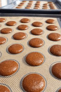 Piekarnik nagrzać do 140 C. Piec makaroniki na średnim poziomie piekarnika, grzałka góra-dół ok 12-15 minut.