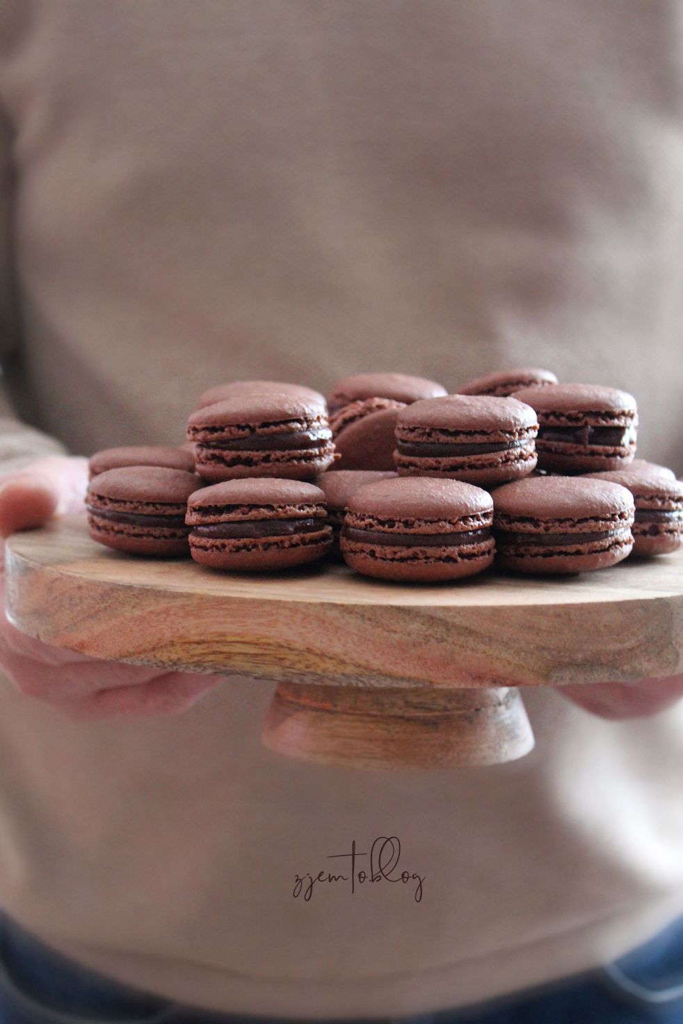 Białka ubić na pianę. W dwóch, trzech turach dodawać cukier. Kiedy piana będzie sztywna i lśniąca, a cukier całkowicie rozbity, wsypać mieszankę mąki migdałowej, cukru pudru i kakao. Całość delikatnie mieszać, dociskając masę szpatułką do brzegów miski. W ten sposób odpowietrzamy masę. To jest najważniejszy moment. Musimy otrzymać właściwą konsystencję masy. Nie może być zbyt gęsta, ale też nie za rzadka. Powinna spływać ze szpatułki, ale też nie za szybko, tak by można było nią „namalować” ósemkę. W ten sposób przygotowaną masę przełożyć do rękawa cukierniczego z płaską końcówką. U mnie o średnicy 1 cm.
