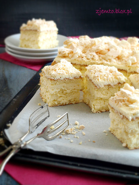 Kremowy, delikatny torcik z ajerkoniakiem i białą czekoladą. Chrupiący wierzch ciasta to słodkie bezy i prażone płatki migdałów. Dla przełamania smaku i zrównoważenia słodyczy pod krem dałam odrobinę dżemu z czarnej porzeczki.
