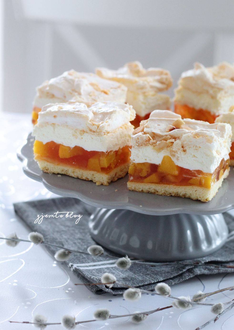 Wiosenna wersja "Malinowej chmurki". Kruche ciasto z brzoskwiniami w pomarańczowej galaretce, bitą śmietaną z odrobiną soku z cytryny i chrupiącą bezą. Moja córka oznajmiła, że w tej wersji ciasto przypomina smakiem gofry z bitą śmietaną i brzoskwiniami. Coś w tym jest 🙂