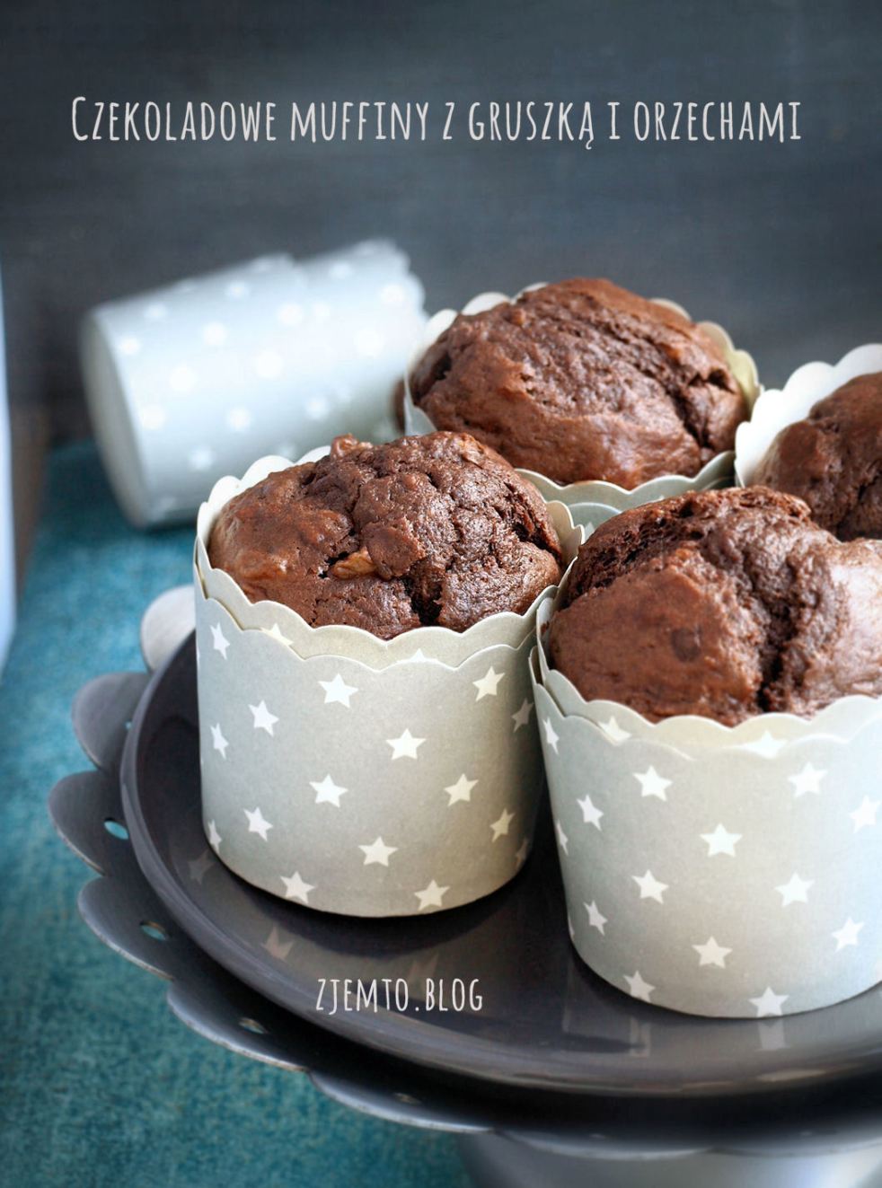 Wilgotne, mięsiste, czekoladowe muffiny z jesiennymi dodatkami - chrupiącymi orzechami i soczystą gruszką. Bardzo prosty, niezawodny przepis bazujący na jogurcie greckim. Pozycja obowiązkowa w sezonie herbaciano-jesiennym.