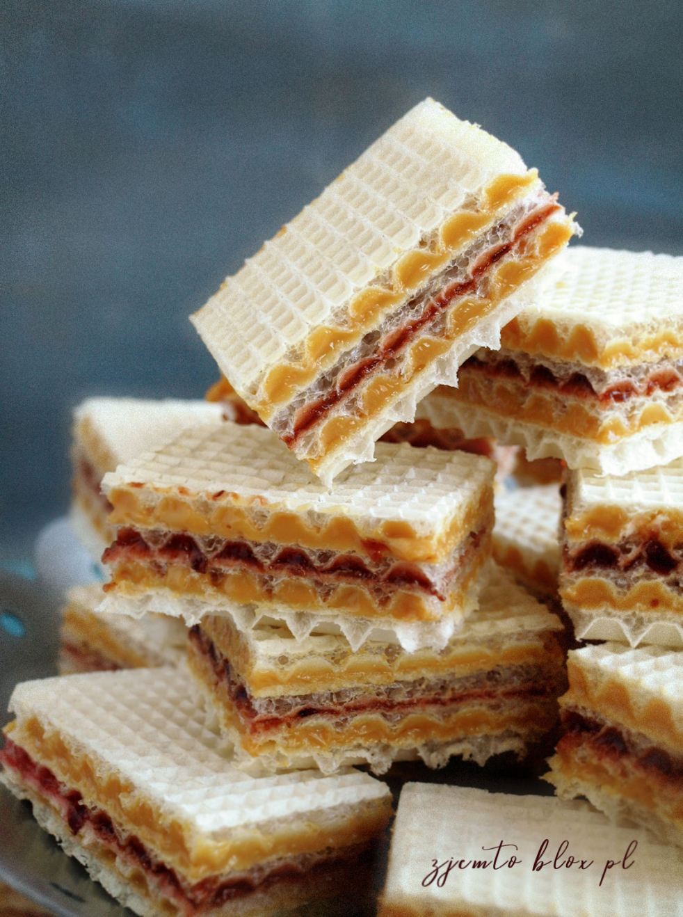 Najłatwiejsze w przygotowaniu i moim zdaniem najsmaczniejsze domowe wafelki. Przełożone słodkim kajmakiem i powidłami śliwkowymi.
