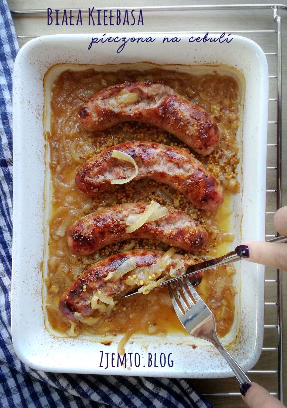 Według mnie najsmaczniejsza wersja białej kiełbasy - kiełbasa pieczona z dodatkiem lekko podsmażonej cebuli, musztardy francuskiej i odrobiny miodu.