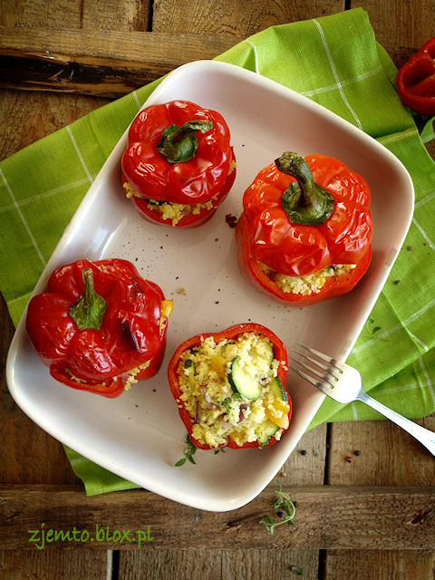 Bardzo podoba mi się kulinarna moda na faszerowanie warzyw. Dynie, bakłażany czy papryki z wielosmakowym nadzieniem, świetnie nadają się na lekki obiad. Ja wypróbowałam farsz z kuskusu, warzyw i sera feta. Wyszło pysznie, lekko i zdrowo. Składniki: 4 duże papryki 2/3 szklanki kuskusu mała cukinia 1 czerwona cebula 1/2 żółtej papryki bulion 2 łyżki drobno… Czytaj dalej Papryka faszerowana kuskusem