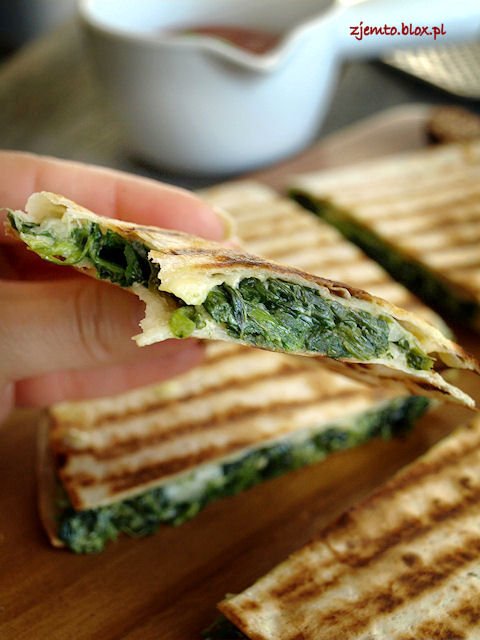 Quesadilla - cudowna w swej prostocie potrawa kuchni meksykańskiej. Jej główne składniki to roztopiony ser i tortilla, reszta to kwestia wyobraźni. Moja wyobraźnia powędrowała w kierunku szpinaku i taką wersję Wam polecam. Jako dodatek do pysznych trójkącików, proponuję jogurt grecki lub sos pomidorowy. Składniki: 4 tortille 1 opakowanie mrożonego szpinaku w liściach ( 450 g… Czytaj dalej Quesadilla ze szpinakiem