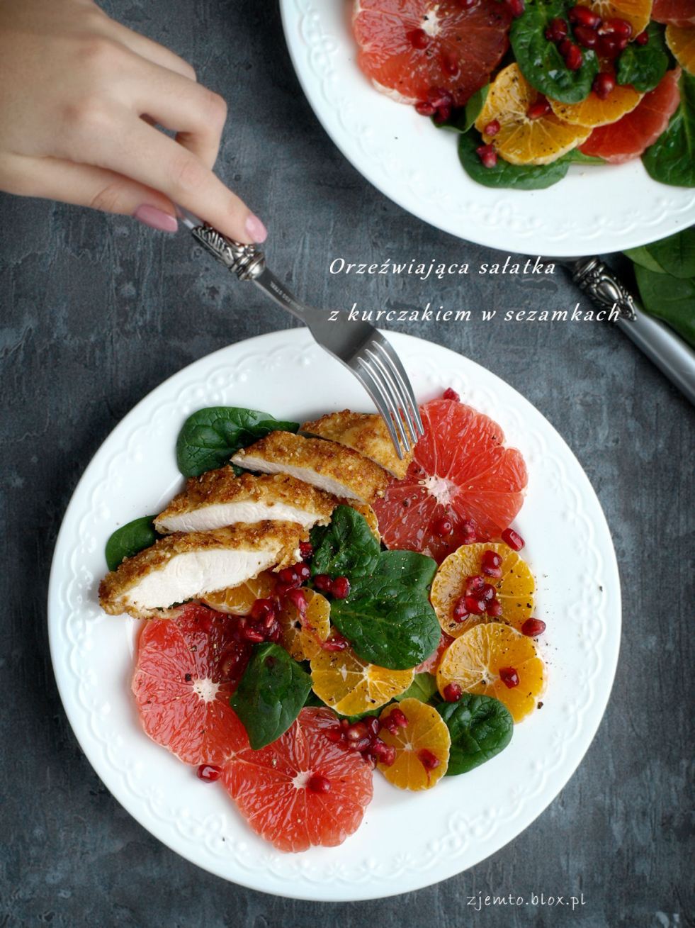 Sałatka z cytrusów z kurczakiem w sezamkach