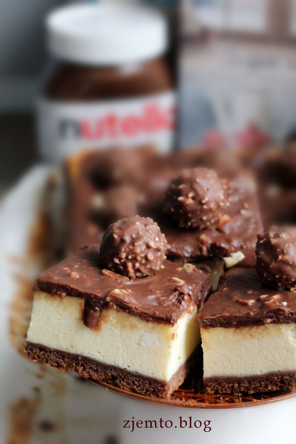 Sernik dla wielbicieli pralinek Ferrero Rocher. Delikatny, lekko śmietankowy, na kruchym, kakaowym spodzie. Zwieńczony pyszną, słodka polewą Rocher, czyli ganachem z mlecznej czekolady, Nutelli i prażonych orzechów laskowych.