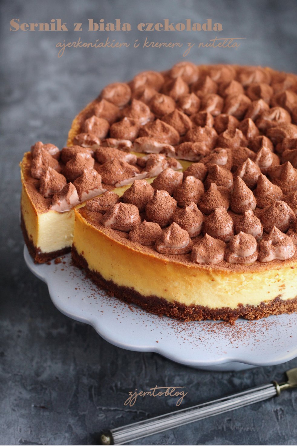 Sernik z dodatkiem białej czekolady i likieru jajecznego. Bez wyraźnie dominującego smaku. Raczej wszystko tu się miesza i przenika tworząc spójną, smakowitą całość. Konsystencją przypomina tradycyjny sernik, bardziej zwarty, wilgotny i treściwy. A kropkę nad i stanowi krem z Nutelli. Pięknie kontrastujący smakiem i teksturą z masą serową. Pysznie, słodko, wciągająco!