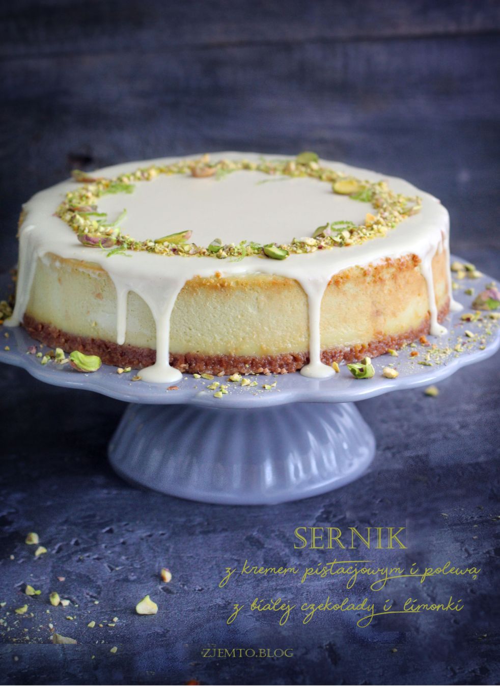 Sernik dla fanów pistacji. Mokry, kremowy, typ sernika nowojorskiego, z dodatkiem kremu pistacjowego. Na pełnoziarnistych herbatnikach z czekoladą. Pyszny i wciągający. A bardzo charakterystyczny smak zielonych orzeszków przełamany jest polewą z białej czekolady i soku z limonki.