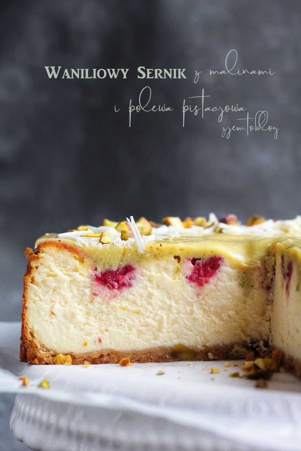 Jeśli lubicie klasyczny smak sernika z wyraźnymi dodatkami ta propozycja przypadnie Wam do gustu. Deliaktna, wilgotna, waniliowa masa serowa podkreślona winnymi malinami i słodką polewą pistacjową na bazie białej czekolady i domowej pasty pistacjowej.