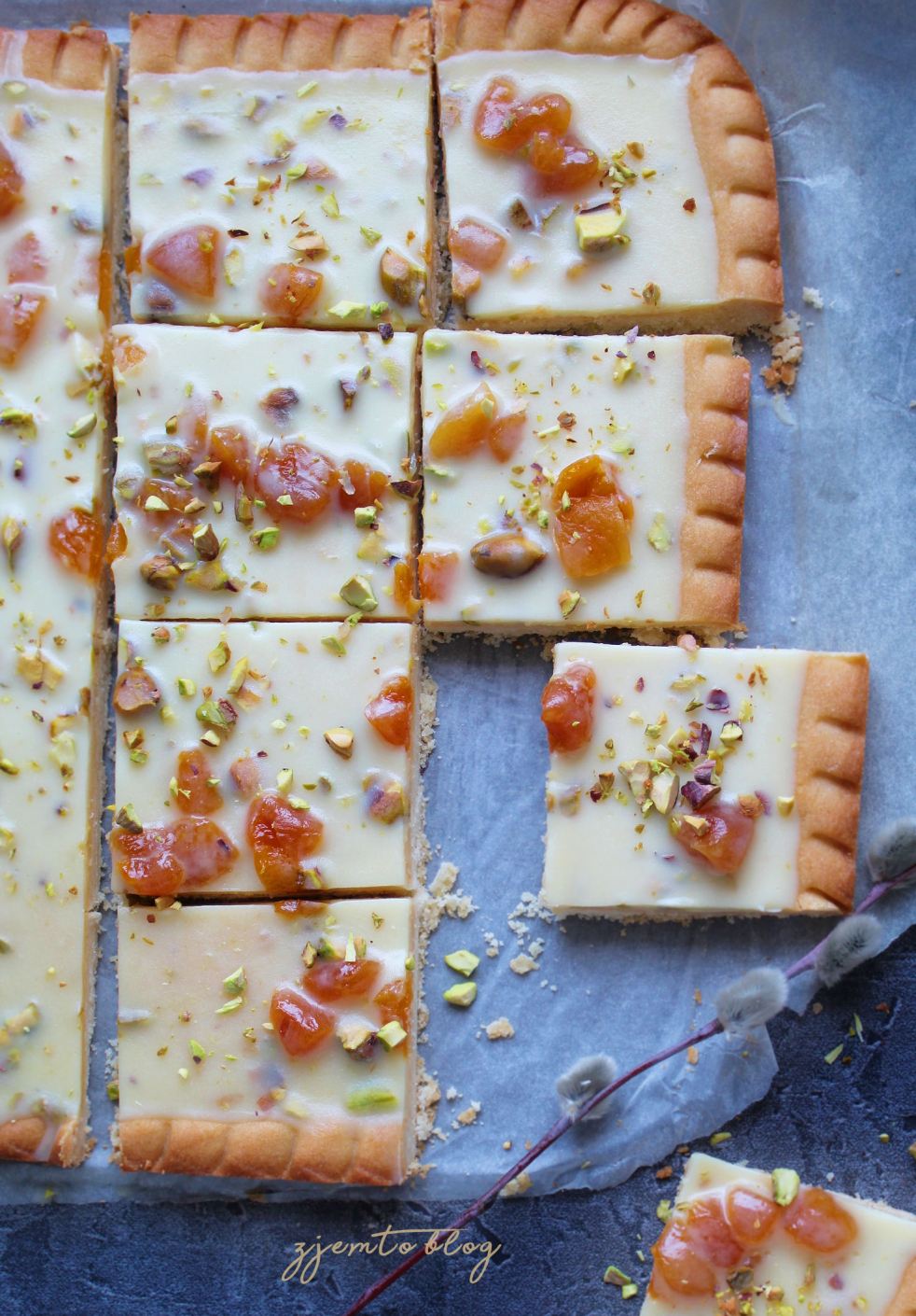 Mazurek z białą czekoladą, morelami i pistacjami