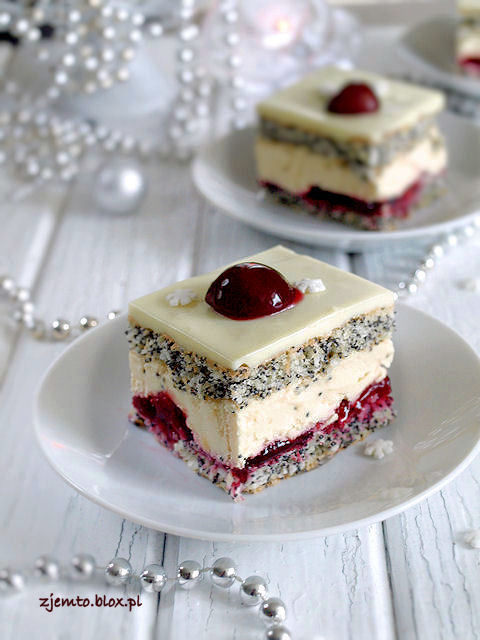 Pyszny torcik w świątecznym odcieniu. Wilgotne, pachnące migdałami makowe blaty