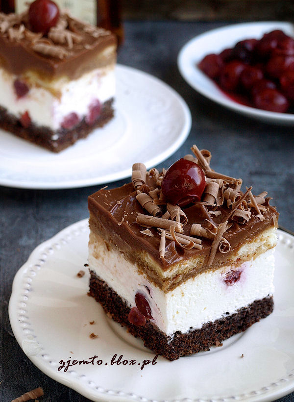 przełożone konfiturą wiśniową i słodkim, kajmakowym kremem.