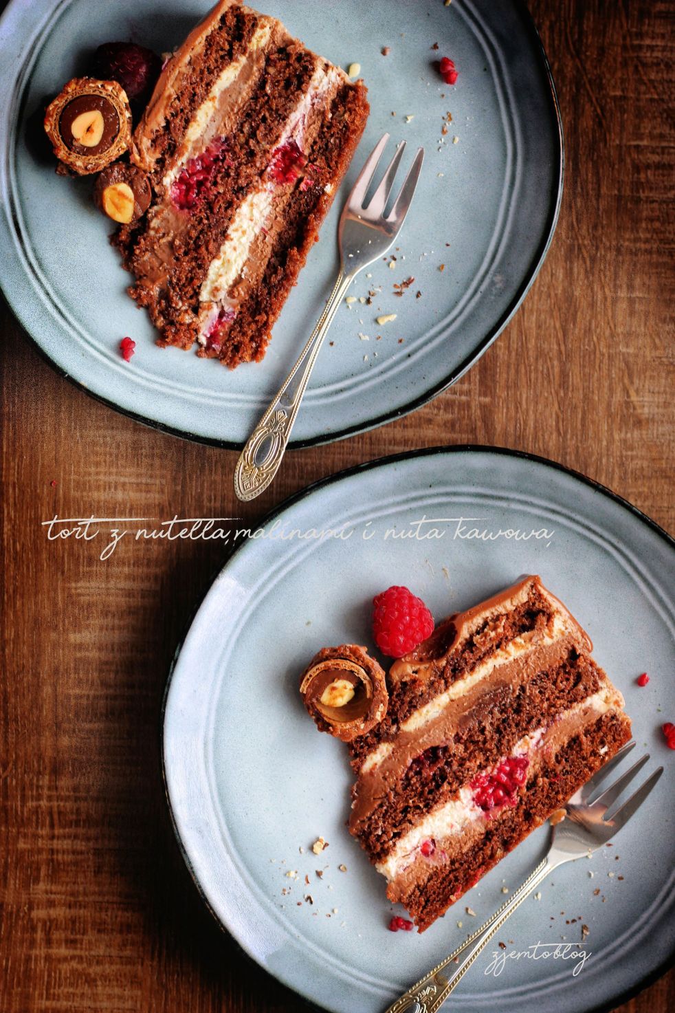 Niesamowity tort na wyjątkowe okazje. Wilgotne, pachnące likierem migdałowym czekoladowo-orzechowe ciasto przełożone kremem z nutelli, malinami w konfiturze i lekkim kremem śmietankowym. Wszystkie smaki podkreśla subtelny dodatek kawy w nasączeniu i obłożeniu tortu. A jakby tego było mało wierzch tortu to pyszna, mleczna polewa czekoladowa.