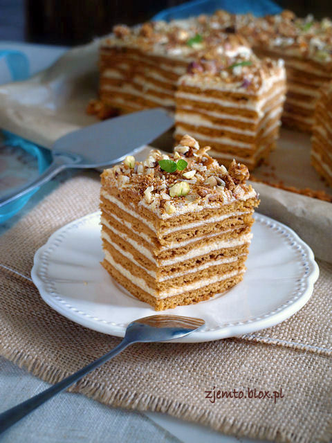 Dzisiaj coś dla fanów miodowników - tort miodowy. Kruche, miodowe ciasto przełożone przepysznym, aksamitnym, budyniowym kremem na śmietance z dodatkiem miodu. Dla przełamania smaku odrobina kwaśnej konfitury. Użyłam domowej z żurawiny, ale sprawdzi się też wiśnia albo czarna porzeczka. Ten tort, w przeciwieństwie do większości miodowników nie wymaga długiego leżakowania, by zmięknąć. Smakuje świetnie już… Czytaj dalej Tort miodowy