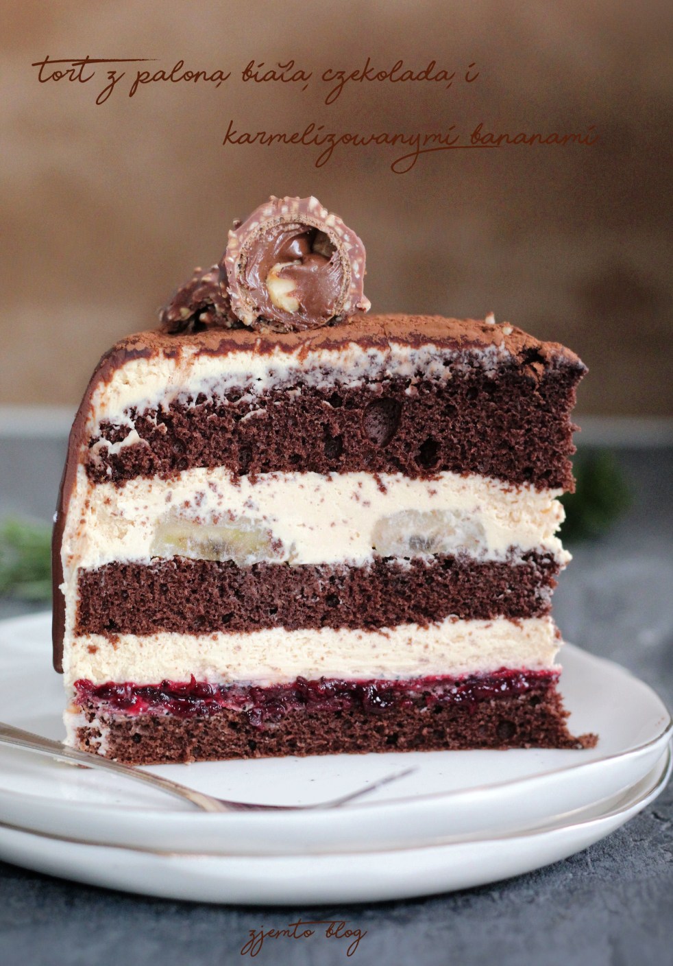 Czekoladowy tort z pysznym, rozpływającym się w ustach kremem z palonej czekolady. Palona biała czekolada w smaku przypomina nieco karmel, z subtelną nutką goryczy i odrobiną kawy. To smak wyjątkowy, zdecydowanie bardziej szlachetny niż samej białej czekolady. I choć krem jest dość słodki i połączony dodatkowo z karmelizowanymi bananami to biszkopt ze sporą ilością kakao i konfitura z czarnej porzeczki równoważą tę słodkość.